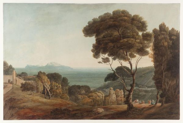 Johannes Christiaan Janson created this untitled watercolour showing a man walking over a stone bridge with a farmer, cow, and sheep. Dominant light washes of pale greens, browns, and blues construct a pastoral scene which, upon closer inspection, reveals a carefully organized composition. The artist uses the winding path and bridge to guide our eye through the landscape, subtly dividing the scene into distinct yet harmonious sections. Notice how the soft, diffused light creates gentle gradations of tone, giving a sense of depth and atmospheric perspective. The bridge itself acts as a structural element, connecting the foreground with the distant, dreamlike castle, symbolizing the union of man and nature. Yet, this construction seems fragile, as though the pastoral harmony could be disturbed. The work invites us to consider how we, too, bridge the gap between observation and deeper understanding.