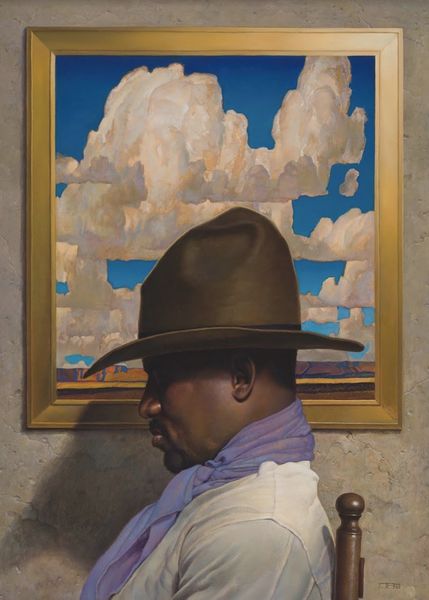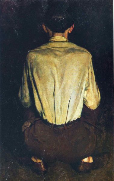 Editor: This is Robert Henri’s "The Failure of Sylvester," painted in 1914. It's an oil painting of a seated figure. I'm immediately struck by the stark contrast between the light shirt and the shadowed face. What compositional elements do you find most compelling? Curator: The dynamic tension between the articulated form of the shirt, delineated by light, and the obscuring shadows is critical. Henri establishes a play of visibility and concealment, highlighting the subject's physical presence while simultaneously withholding access to his identity through the obscured facial features. The loose brushwork enhances the expressive quality of the work. How do you see Henri manipulating form and light to convey meaning? Editor: I see how the quick brushstrokes build form, but I am interested in the composition. The figure is centralized, yet seems almost swallowed by the chair, further reinforcing the "failure" suggested in the title. The muted color palette feels purposeful in establishing this mood. Are there underlying philosophical concepts at work here, would you say? Curator: Precisely. Consider the structural opposition: the figure's pose conveys a sense of resignation, the slump mirrors the curves of the chair itself. This compositional mirroring extends beyond simple repetition; it creates a symbolic enclosure. How might this strategic use of composition inform our understanding of the artwork's narrative? Editor: That's a great insight. The mirroring emphasizes the figure’s dejection. By obscuring his face, Henri focuses on posture and form to convey the emotional weight. I now notice the contrast between the crispness of the shirt versus the softer forms of the rest of the painting, which furthers this distinction. Thank you! Curator: Indeed. By deconstructing the artwork’s formal elements and understanding their interrelation, one can reveal complex layers of meaning embedded within it. It has been a worthwhile exercise, demonstrating the richness found in the formal analysis of Robert Henri's painting.