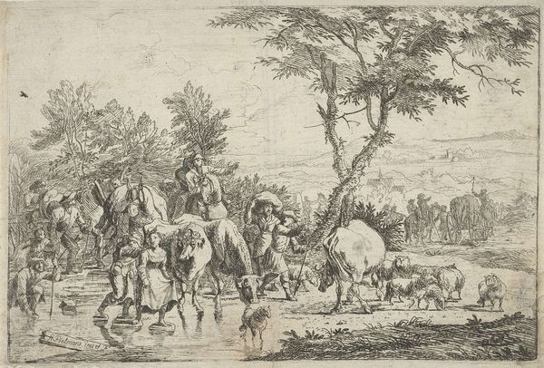 Barend Hendrik Thier made this drawing, “Landschap met een schaapherder en een ruiter bij een poel,” with pen and gray ink, accentuating it with gray wash. The interplay of light and shadow immediately draws us into the scene’s pastoral serenity. The composition is structured around a body of water, bisecting foreground and background with figures arranged to lead the eye. Observe how Thier uses line and wash to define forms and textures, from the rough bark of the tree on the left to the soft wool of the sheep. This meticulous rendering invites us to consider the artwork's semiotic functions: The shepherd, horseman, and animals do not merely represent rural life, but are meticulously arranged to create a sense of harmonious order. The architecture of landscape elements with a framing tree on the left and a cave on the right contributes to a balanced, yet dynamic composition. Consider how Thier's formal choices reflect the period’s philosophical leanings, emphasizing a rational appreciation of nature, which makes this drawing not just an aesthetic experience, but also a cultural artifact.