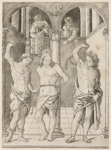 Giovanni Antonio da Brescia created this engraving, "The Flagellation of Christ," around the early 16th century. The scene's architecture, with its repeating arches and solid columns, provides a structured backdrop to the chaotic violence. The composition uses stark lines and dramatic contrast to enhance the emotional intensity. Notice how Christ is centrally positioned, tied to a column, which anchors him amidst the flailing figures. This creates a visual hierarchy emphasizing his suffering. The torturers, rendered with dynamic, almost frantic lines, encircle him, their actions forming sharp diagonals that disrupt the classical harmony of the arcade. The artist’s decision to use engraving—a medium known for its precision—adds to the scene's tension. The structured, linear nature contrasts with the chaotic narrative, underscoring the brutal imposition of order over humanity. This interplay is not just an aesthetic choice, but a commentary on power, suffering, and the disruption of established orders.