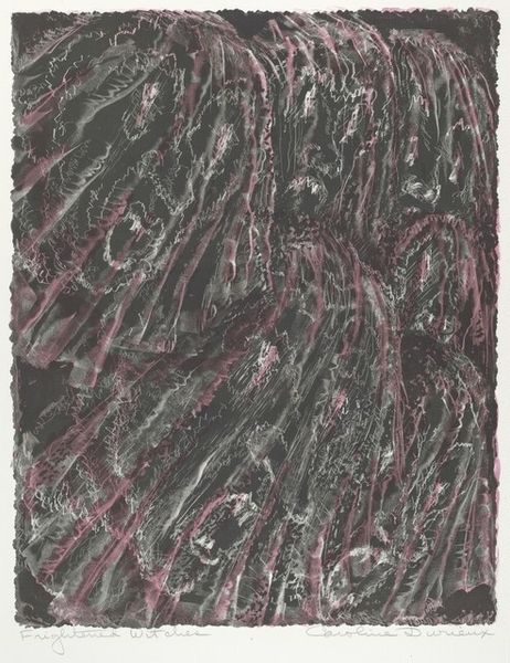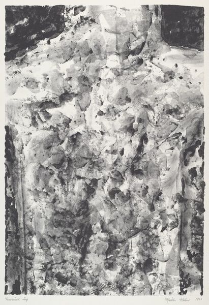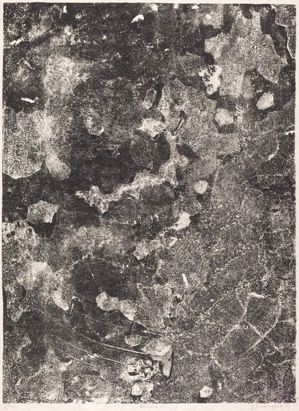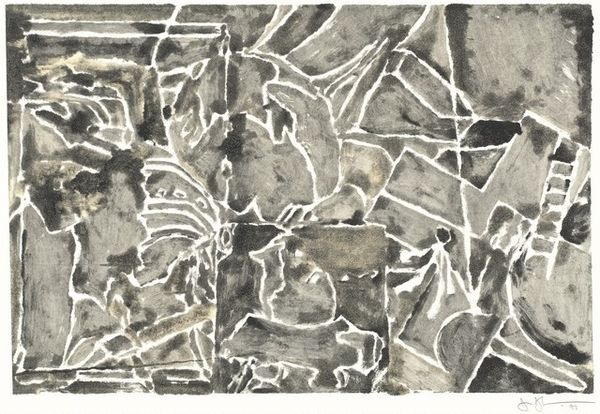 Curator: This intriguing piece is "Devoted," a 1970 mixed-media print by Mark Tobey. It seems to be ink on paper. What's your immediate take? Editor: It feels almost like an aerial view, a sort of obscured topography, or maybe a microscopic exploration. The limited palette lends it a contemplative, almost somber mood, don’t you think? Curator: I see it similarly! I think this work reveals an intimate, perhaps even spiritual, understanding of symbols. Each mark contributes to a web, a community almost, pointing to ideas of interconnection. Editor: That sense of community speaks to me. Tobey's abstraction resists easy interpretation. But I wonder about devotion. Is it devotion to form, to spirit, or to the collective whole? And what are the social and historical factors in 1970 that may be expressed? The work echoes that tumultuous period. Curator: Precisely! Tobey was deeply influenced by Eastern philosophies, specifically the Baháʼí Faith. Devotion in this sense is about faith—a connection to something bigger, and finding peace within complex networks. The web he presents shows connection and structure—perhaps it represents the devotion within humanity. Editor: And the geometric forms? Are those purely abstract, or do they function as codified elements that create and reiterate that sense of collectivity you're highlighting? Curator: It's both, I believe. Abstraction provides room for universal connection, transcending any one dogma, but he brings forms into existence as echoes of existing shapes in nature, geometry allows us to create a foundation. Editor: It strikes me how his spiritual journey connects to his radical approach to artmaking—abstracting from concrete form, towards universality. That idea of universal form also seems rooted in resistance towards other more divisive concepts, maybe? Curator: Absolutely. It offers solace, a vision of harmony that stands in contrast to division. These prints show how devotion allows one to form community from even what feels broken. Editor: Very powerful. Thanks to Tobey for urging this consideration; art as resistance, reflection, and connector. Curator: A wonderful final sentiment for Mark Tobey, indeed.