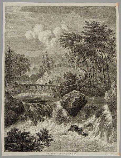 Editor: This print, "Waterfall" by ? Smyth, presents a tranquil scene. The cascading water is so energetic. What symbols do you see at play here? Curator: The waterfall symbolizes the passage of time and the constant flux of life. Notice the bridge; it's a visual motif representing a connection between the earthly and spiritual realms. Editor: That’s interesting. I hadn’t considered the spiritual aspect. Curator: Consider how water has been used throughout different cultures as a purifying element. What emotions does this artwork evoke in you? Editor: I feel a sense of peace, but also a subtle reminder of nature's power. Curator: Precisely, the piece merges tranquility with the sublimity of nature, offering a space for reflection on our place within it. Editor: I’ll never look at a waterfall the same way again. Curator: Each symbol resonates differently across time and experiences, adding layers to its interpretation.