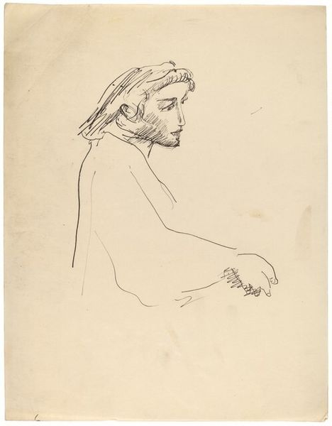 Editor: Luigi Lucioni's 1920 etching, simply titled "Head," has a quiet and somber mood for me. I am really drawn to the artist's deliberate use of line to capture the sitter's gaze and expression. What strikes you when you view this work? Curator: The strategic use of line, precisely as you noted, commands my attention. Lucioni expertly modulates line weight to generate depth and volume. Observe the delicate, almost imperceptible lines defining the background compared to the dense hatching used to render the sitter's face. Notice how this creates a visual hierarchy, pushing the subject forward, further contributing to its power. How do you think the choice of the etching process impacts the work? Editor: The etching technique adds to its unique effect. The lines almost seem fragile but that provides an emotional quality to the art, right? The texture makes you feel more engaged than a typical portrait. What kind of formal qualities make this portrait strong? Curator: Indeed. Formally, the strength of this portrait lies in the carefully balanced asymmetry and restraint. The subject is placed in profile, which allows Lucioni to meticulously depict the contours of her face, emphasizing the planes and angles. There's an intriguing tension between the realism achieved through detail and the ethereal quality imparted by the etching technique. The blankness in the background makes us focus completely on the textures of the head. What is your feeling towards its form and lines? Editor: It feels complete in what it shows and suggests! Thanks for guiding my focus on the interplay of line and composition; seeing it from this point is more impactful than my initial reaction. Curator: You're most welcome. Analyzing the formal elements allows us a deeper appreciation for Lucioni's technical skill and his insightful depiction of human character through simple graphic form.