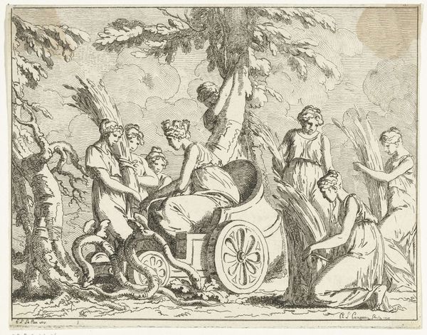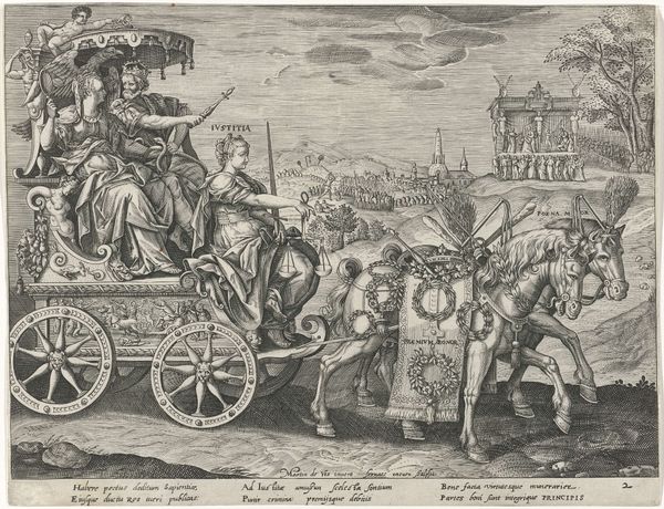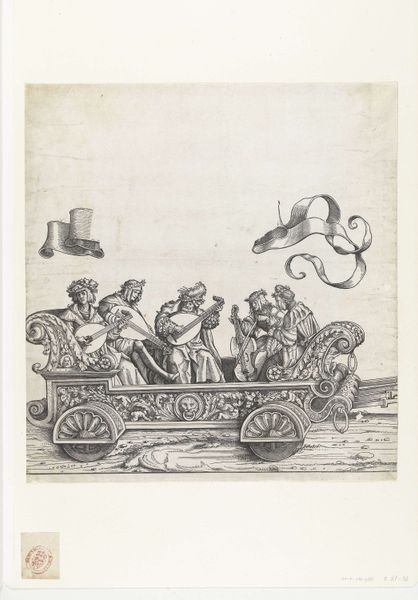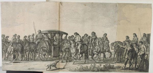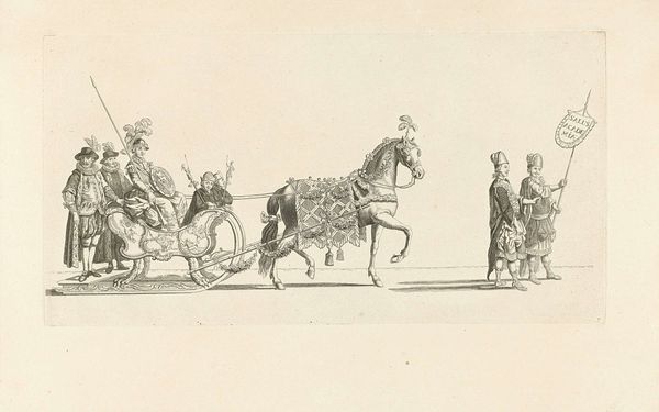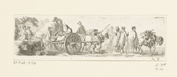 Crispijn van de Passe II created this engraving, "Overspelende echtelieden op een wagen," which translates to "Adulterous couples on a wagon," during the Dutch Golden Age, a period marked by significant social and cultural shifts. The print offers a glimpse into the era’s attitudes toward morality and gender roles. Adultery, particularly by women, was not just a personal failing but a public matter with legal and social repercussions. The shaming wagon, driven by a Pan-like figure, underscores the public humiliation inflicted on those deemed to have transgressed marital vows. The varied reactions of the figures on the wagon—from shame to defiance—suggest complex emotions tied to the lived experience of gender and societal expectations. The imagery challenges us to consider how early modern European society negotiated issues of morality, public shame, and the precarious position of women within marriage. It reminds us of the emotional and social lives intertwined with historical norms.
