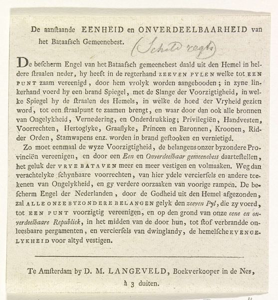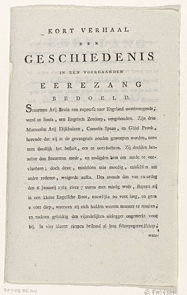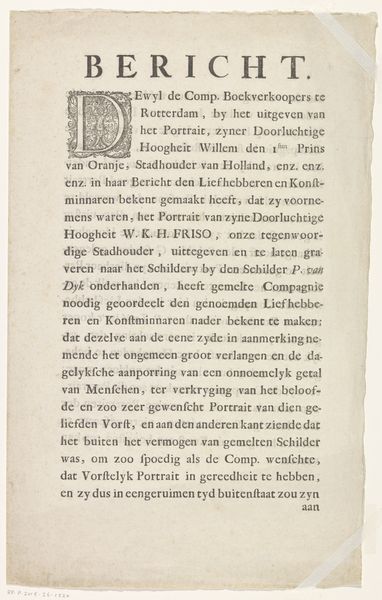 Curator: This engraving, titled "Bericht bij de uitgave van zes portretten van stadhouders en vorsten," from 1748-1751, is really striking. Editor: It's basically a printed advertisement, isn't it? It gives off a very formal, almost austere vibe with its tight typography. What is it that stands out to you in this piece? Curator: For me, it's about understanding the context of printmaking in the mid-18th century. Consider this print not just as an advertisement but as a product of specific labor, materials, and a burgeoning book trade. The texture of the paper, the precise lines of the engraving achieved by Pieter Tanjé - these aren’t neutral; they speak to a system of production. How do you think the cost of "25 stuivers" influenced its distribution and consumption? Editor: I see what you mean. It's not just about the image, but about the whole industry that made it possible and accessible. Twenty-five stuivers—that was a calculated price point. Was printmaking considered high art at the time? Curator: That's exactly the question. By examining print as a commodity, we challenge the rigid boundaries of art. The division of labor – the publisher, the engraver, the distributors – each played a role. It makes you question who the 'artist' really is here. What does it tell us about the relationship between art and commerce? Editor: That's fascinating. I hadn't considered it that way, thinking about the labor involved in creating and distributing it. This shifts my focus entirely from aesthetic judgment to the socio-economic context. Curator: Precisely. Analyzing the materials and modes of production reveals a wealth of information, moving beyond just the aesthetic qualities. It really illuminates a specific historical and cultural moment, doesn't it? Editor: Definitely, it makes me look at the material production as meaningful cultural work. Thank you!