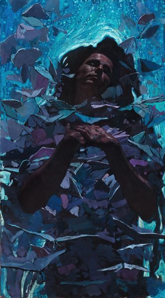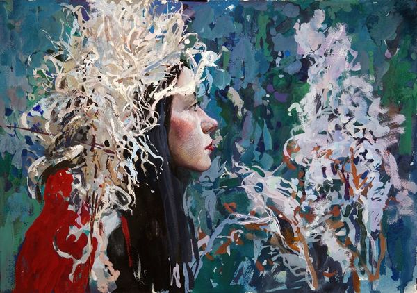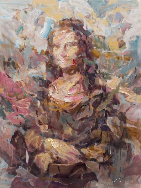 Curator: Welcome. We're looking at "Chrysalis" by Timur Akhriev. It appears to be a mixed-media work, dominated by oil paint and what looks like impasto application. What are your initial impressions? Editor: Visually arresting. The juxtaposition of the realistically rendered face against the almost violently abstract background—or is it foreground?—creates a powerful tension. It's as if the figure is simultaneously emerging from and being consumed by… chaos? Curator: Yes, I think that tension is key. Akhriev is dealing with figuration, but pushing it to the brink of abstraction. We see this push and pull happening in a lot of portraiture concerned with questions of identity, the pressures of society, perhaps, obscuring the individual. Editor: I'm struck by how the brushstrokes, particularly around the face, almost sculpt the form. The thick, textured application of the oil is remarkable. It certainly gives the portrait a tangible weight, grounding it against the wild colors surrounding it. I wonder what this says of self. Curator: The artist, although his exact dates are somewhat hazy, was certainly influenced by the Expressionists. This painting feels of a piece with that tradition, which, after the world wars, became increasingly interested in conveying interior emotional states, often through distorted forms. It's interesting how the “frame” has entered the plane of the subject. Editor: Distorted forms, absolutely, but I wouldn't discount the deliberate arrangement of color. Look at how the blues and purples around the face draw our eye into it. The impasto, then, almost traps the face, holding it. Do you agree the painting draws inspiration from Abstract Expressionism? The movement influenced artists to focus on the process of creation as much as the final product. I believe we see that here. Curator: Certainly. And think of Abstract Expressionism’s links with the psychoanalytic theories of figures like Jung—the idea that abstraction could give us access to universal, shared experiences, the collective unconscious. Akhriev seems interested in pushing and pulling at similar boundaries, using the expressive qualities of paint itself. Editor: It leaves me pondering the power of paint and brush, color and form, the tools Akhriev masterfully utilized in inviting the beholder to consider, if only momentarily, the nature of self, nature and existence. Curator: A fitting conclusion. Akhriev encourages us to reflect on the complex relationship between external appearance and the tumultuous inner life, an exercise as socially relevant today as it ever was.