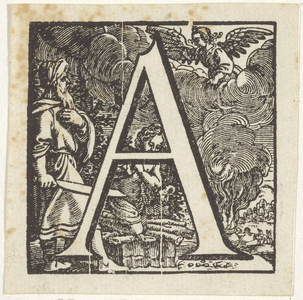 This is a decorative woodcut of the letter A, adorned with foliage and a human face. The letter itself, bold and stark, stands amidst a flurry of swirling leaves and tendrils, alluding to nature's vibrant yet untamed essence, a reflection of our deepest yearnings. Note the face subtly integrated into the design, a “mask” that reminds us of ancient theatre, where faces were a vehicle for projecting emotions and archetypes. We see such masks throughout history, from the tragicomic visages of Greek drama to the grotesque masks of medieval carnivals. Consider how this motif has been passed down through history, evolving and shifting in meaning. Initially intended to evoke the spirits of nature, it now appears merely as a decorative element, a distant echo of its earlier, more profound significance. Yet, the collective memory persists; subconscious processes may have subtly influenced the creation and interpretation of this motif. The image, therefore, is a powerful force, engaging viewers on a deep, subconscious level, resurfacing and evolving, taking on new meanings across different historical contexts.