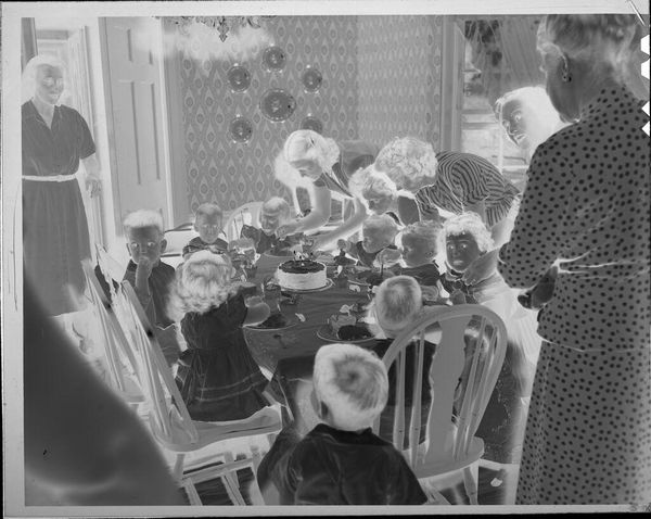 Editor: Here we have an intriguing little photographic print, Untitled, by Lucian and Mary Brown. What catches my eye is how the light almost seems to emanate from the figures themselves. What’s your initial impression? Curator: It's like a memory, isn’t it? The stark contrasts and almost ghostly figures lend it a dreamlike quality. I wonder if it's intentional or a trick of the photographic process, playing with ideas of presence and absence. Does it feel staged or candid to you? Editor: More candid, maybe a fleeting moment captured? I see both stillness and activity. Curator: Exactly! It invites us to imagine the conversations, the silent connections in the room. Photography has a way of freezing time, doesn't it, allowing us to ponder lives intersecting, even briefly. Editor: It does. I didn't consider how the momentariness changed my reading.