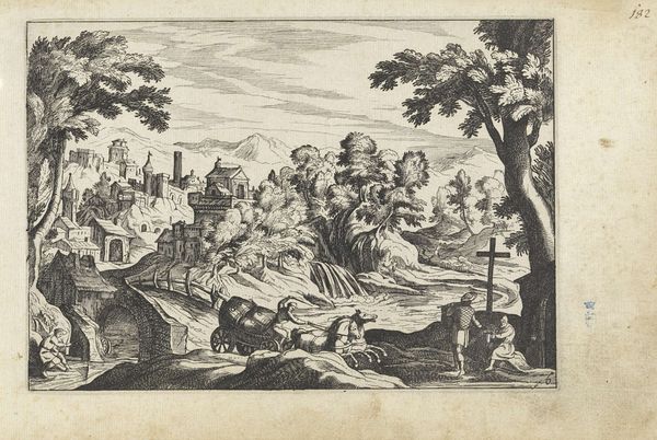Editor: Here we have Jan van Ossenbeeck's 1660 engraving, "Verzamelen van het manna door de Israëlieten", or "Gathering of Manna by the Israelites". The detailed figures and landscape, all rendered in fine lines, give it an almost dreamlike quality. How do you interpret this work formally? Curator: Let's begin by noting the artist's deployment of line. Observe how Ossenbeeck uses varied line weights to create depth and shadow, particularly in the articulation of the human figures and the landscape elements. What does this variation achieve formally? Editor: It gives a sense of volume and realism, I suppose. It guides my eye. The darker lines bring focus, pulling certain figures forward while receding into softer lines to portray distant terrain. Curator: Precisely. Note also the composition. The artist employs a dynamic arrangement, populating the foreground with active figures and directing the viewer's gaze towards a receding, multi-layered landscape. What is the effect? Editor: The busyness of the scene almost feels like an attempt to fill all the available space. My eyes dance all over it. There’s an energy, a flurry, and everyone is working, yet relaxed in nature. Curator: Interesting, you identified dynamism and energy that I see. Now, considering the overall tonal range, how would you characterize the use of light and shadow and its effect on the print's overall formal quality? Editor: It’s bright, allowing the figures to stand out, especially those near the tree on the right, emphasizing the divine abundance in a structured fashion? This highlights a narrative focal point in a balanced manner. Curator: Indeed. By analyzing these elements, the line work, the composition, and the light effects, we've gained insight into Ossenbeeck's structured depiction of a significant story. Editor: It is clear the artist sought to represent a structured view using the materials available. Thank you. I’ve certainly learned a lot through our conversation.