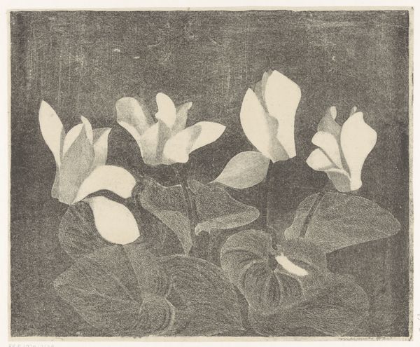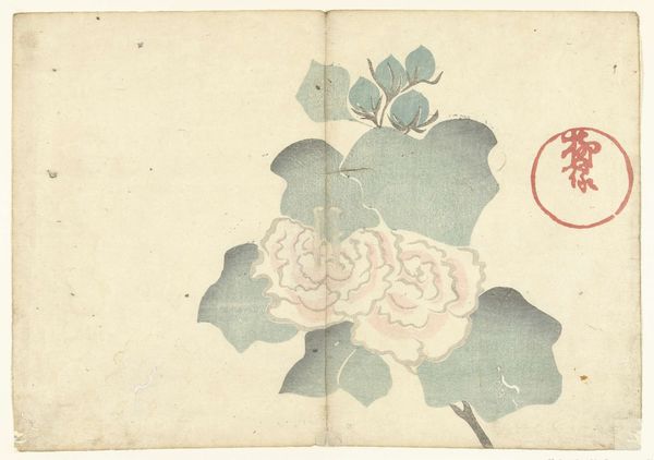Nakamura Hōchū created this woodblock print known as ‘Stokroos’. The muted palette of pinks, greens and greys is immediately striking, creating a serene, almost dreamlike atmosphere. The composition emphasizes flat shapes and lines rather than depth, which aligns with the Rinpa school's decorative aesthetic. Note how the leaves are simplified into geometric forms. The use of negative space is also crucial; the blank areas of the paper are not just empty but actively contribute to the image's balance. Hōchū’s work destabilizes traditional notions of representation. It offers a meditation on form and space, inviting viewers to appreciate the abstract qualities of natural subjects. His work reflects a broader interest in the semiotic potential of visual elements during this period, challenging fixed meanings and engaging with new ways of seeing the world. The simplified forms encourage a shift from mere representation to an appreciation of the aesthetic structure itself.