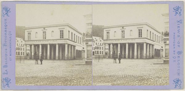Editor: This is a stereoscopic photograph titled "Gezicht op een badhuis in Spa," taken between 1866 and 1870 by Jules Hippolyte Qu\u00e9val. The sepia tones and neoclassical architecture give it a very formal and imposing feel. What do you see when you look at this piece? Curator: What I see is a document of social stratification rendered in light and shadow. A bathhouse in Spa during this era wasn't merely a place for hygiene; it was a site of social gathering, leisure, and often, political maneuvering for the elite. Photography, as a relatively new medium, was also finding its place in constructing and reinforcing these power structures. Consider who had access to being photographed, who could afford to visit Spa. Editor: So you're saying that the very act of capturing this scene through photography underscores existing social inequalities? Curator: Precisely. And let's examine the neoclassical architecture itself. The bathhouse emulates the grandeur of ancient Roman bathhouses. Neoclassicism, you'll remember, was embraced by powerful nations seeking to legitimize their own authority, linking themselves to an idealized past. In this way, the image is not just a neutral depiction of architecture, but also a symbolic statement about power, heritage, and belonging. Editor: It’s interesting to consider how even a seemingly straightforward cityscape can be loaded with these layers of meaning. Did Qu\u00e9val consciously intend this message, or is it more of a reflection of his time? Curator: Intention is difficult to ascertain, but the very selection of subject matter, the framing, and the conscious deployment of photography all point towards a worldview shaped by the prevailing social and political currents. By situating it within a broader historical and cultural context, we start to reveal the intricate web of meanings embedded in the image. Editor: I see what you mean. This has totally changed how I view seemingly simple photographs. It's more than just documentation; it's a social text. Curator: Indeed. Art invites us to critically examine the world around us, and photographs like this one can open up avenues for conversations about class, representation, and power.
