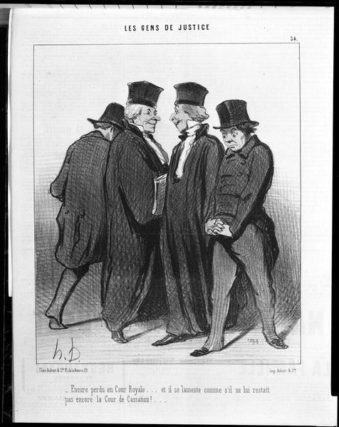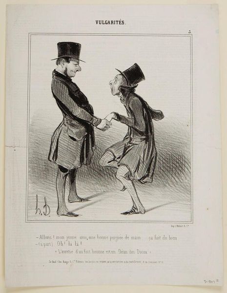Curator: It's delicious irony, isn't it? This lithograph by Daumier, with its endless title about arguments and justice, feels incredibly charged, as though he has just finished drawing it. Editor: Yes, this piece, "You've injured me by your argument…", it feels really tense! The man on the left is grabbing the other by the collar, while the other three are staring back at the viewer, with an obvious air of shock. What should we make of this scene? Curator: To me, it speaks of the simmering tension beneath the veneer of 19th-century French society. The justice system, meant to be a pillar of order, is revealed here as being just as prone to conflict and absurdity as anything else. Can't you almost hear the shouting? Editor: It's all in the faces, isn't it? Thanks, I now see a different view of justice through the image.