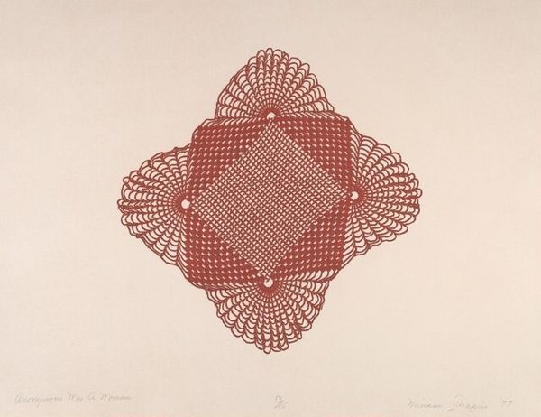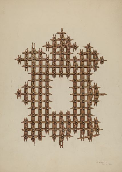 Curator: This is "Cheese Basket," a drawing on paper by George File, dating from around 1941. It strikes me as a detailed exercise in representing form. Editor: Ah, yes, right away it breathes a sense of domestic intimacy. The precision is amazing; it gives the everyday object a gentle dignity, don't you think? Curator: Precisely, it prompts one to consider the cultural implications of basket weaving itself as both art and utility, challenging established hierarchies within the art world. Look at how each strand overlaps to create these star-like openings. This is hardly detached observation! Editor: Oh, I see, yes! There's definitely a sort of joyful order on display. I love how File manages to capture not only the structure, but the light filtering through. Almost playful, if that doesn't sound absurd talking about a basket. Curator: Not absurd at all! This intricate design serves a material function, to hold and preserve. Think about the process: gathering the reeds, soaking them to gain pliability, interlacing, drying. All of these material actions culminating in this very form that is, at its very basic core, geometric and practical. Editor: You're so right to bring in that element of preservation! Cheese, being perishable, suddenly gains another dimension when situated in the woven containment File gives it. Makes one almost nostalgic. And perhaps nostalgic too for the touch, the artistry involved in these everyday skills of previous generations. Curator: Yes, File elevates this humble cheese basket to something worthy of study. This choice, to focus so keenly on an object of such basic, rustic origins, hints at deeper cultural commentary, doesn't it? I mean, what do you even read out of such formal rigor? Editor: Formally, its perfection is deeply calming to look at. This makes me wish to find an old family photo, if possible; my old grandpa had a very similar basket in his backyard, so it holds a different, private emotional key. I imagine a picnic and a rural idyll. Curator: What it tells me, at least, is of File's vision, taking what could have been purely functional to transform it into, well, what we have here! Editor: Agreed. This seemingly simple picture definitely sparks off a multitude of resonances!