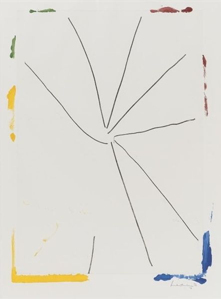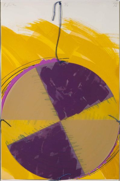 Editor: Here we have Jack Bush’s vibrant work, "Cross Over," held at the Tate. The intersecting bars of color over the textured yellow field create a striking image. How do you interpret this work within the context of its time? Curator: Well, considering Bush's abstract expressionist background, the image reflects a move toward simplified forms. It makes me think about the tension between individual expression and the increasing institutionalization of abstract art at the time. How does it strike you in relation to the galleries and museums where you’ve seen similar works displayed? Editor: I guess I never thought about how the art world itself shaped the art. I’ll definitely think about that more from now on! Curator: Exactly! The context is crucial.