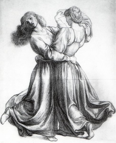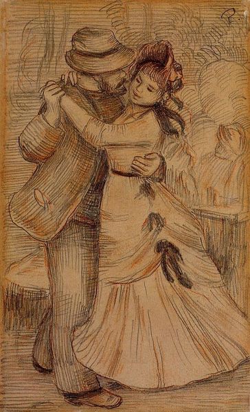 Curator: Welcome! Here we have Pierre-Auguste Renoir's "Dance in the Country," painted in 1883, a watercolor on paper. Editor: Well, it's certainly lively! You immediately feel caught up in the music, or maybe it's just their energy. It seems so fleeting, like capturing a moment only seen out of the corner of your eye. Curator: Absolutely. It captures that ephemeral quality characteristic of Impressionism, even in this preliminary work. It also resonates with the rise of leisure culture in the late 19th century, where public spaces for dance and socializing became increasingly important. Editor: I get this sense of the bohemian from it. You can see the couple totally lost in their movements, yet other scattered facial drawings sit eerily alone near the painting's right edge as if to say everyone needs a dance partner. What is going on with that!? Curator: Those disembodied faces are likely exploratory sketches by Renoir, offering insight into his artistic process. Some have argued this piece speaks to the evolving roles of women in society and the artist's own vision. The original painting that he derived it from received conflicting remarks in its original moment in French Salon society. Editor: Fascinating. Look at how loosely the details are handled - yet there's such warmth, particularly in how the light seems to catch the woman's dress. The textures of her patterned clothing compared with his tailored coat—lovely contrast. Curator: Renoir was known for his skilled handling of light and color, aiming to evoke emotion and fleeting beauty through those elements. This particular style and artwork captures the romantic idealism associated with French Romanticism but is distinctly Impressionist in style. Editor: It definitely leaves a lingering feeling, this little dance frozen in time. One is moved to think more deeply about those historical dance movements as well as the contemporary possibilities for human affection. Curator: Exactly. Hopefully it gives visitors insight not just to one masterwork but into society's views of romantic encounters, pleasure, and play throughout the Impressionist period. Editor: It gets my feet tappin'.
