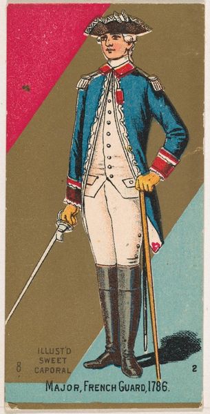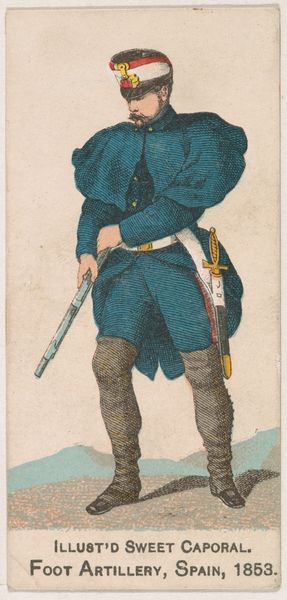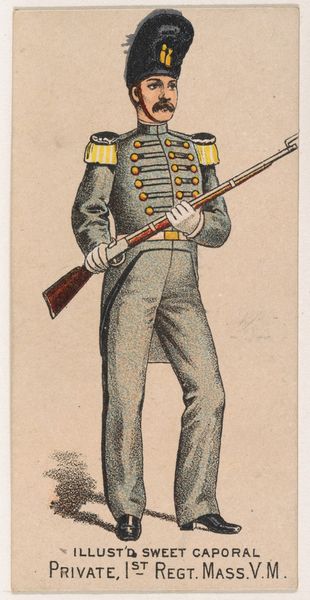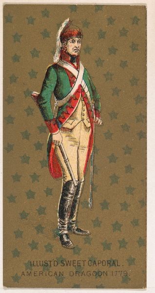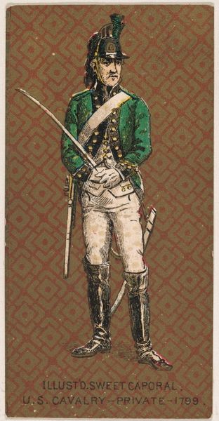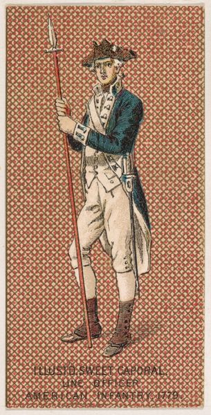 Editor: Here we have "American Light Infantry, 1782," a print from 1888 by the Kinney Tobacco Company, employing colored pencil. The detail for a cigarette card is surprising! What do you make of its composition? Curator: Let's begin with the formal arrangement. Notice the pronounced verticality: the soldier’s figure, the rigid rifle. The artist employs this to establish a sense of stoic composure. Observe the contrasting diagonals formed by the white crossbelts, creating visual tension. What effect do you think is intended here? Editor: It certainly draws the eye in different directions! Perhaps to add movement, preventing the image from feeling too static? Curator: Precisely. The controlled palette further reinforces the formal structure. The muted greens and browns create a somewhat somber tone, contrasted only by the stark white, effectively delineating form and highlighting key elements of the uniform. The chromatic restraint is quite deliberate. Editor: It's interesting how the artist balances clarity and restraint. It almost feels...staged. Curator: Indeed, there’s an undeniable artificiality. Every detail is meticulously rendered, yet lacks genuine dynamism. The pose appears calculated. Do you feel this calculated effect extends to the surface texture itself? Editor: It does. The coloring appears quite smooth and uniform. Now that I consider it more deeply, I find the smoothness diminishes the artwork. It makes it seem rather mass-produced, which is somewhat contradictory, since it does have such precise detail. Curator: A valuable observation! The technical precision serves, paradoxically, to underscore the distance between representation and reality, emphasizing the print’s constructed nature. I appreciate your ability to attend to formal and material components simultaneously! Editor: And I see how attention to these formal components can help understand not just the appearance but the *feeling* of a piece. Thank you!