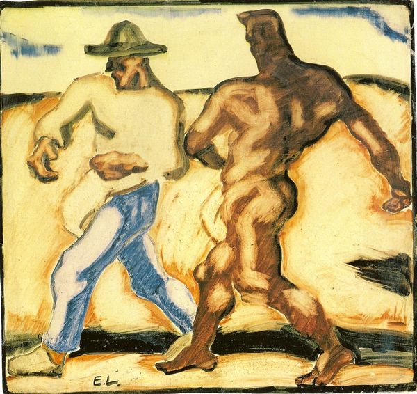 Editor: So, this is Arsen Savadov’s "Untitled," painted in 1996 using oil paint. The stark contrast between the figures immediately grabs your attention; it feels charged and unsettling. What structural elements do you notice that contribute to that tension? Curator: Indeed. First, consider the use of chiaroscuro, the stark contrast between light and shadow. This heightens the drama, doesn’t it? Observe how the light accentuates the muscularity of both figures, drawing attention to their physical presence and the power dynamic. Editor: It does, it's hard to look away! What about the composition? Curator: Note the spatial arrangement. The figure in the tutu dominates the foreground, his back turned, presenting a barrier to the viewer. The other figure, kneeling and seemingly vulnerable, is pushed back into the pictorial space, yet his direct gaze implicates us. Savadov plays with perspective to create unease. What do you make of the artist’s brushwork? Editor: I see how the loose brushstrokes add to that feeling. They seem almost frantic, especially in the background and around the tutu, as if to suggest the instability of the situation. It also brings attention to the very act of painting itself. Curator: Precisely! The materiality of the oil paint, its texture and application, becomes an integral part of the work's meaning. Savadov isn’t just depicting a scene; he's creating a visceral experience through formal means. We are drawn into this disturbing dynamic via light, form, and the gestural quality of the brushwork itself. It is through those aesthetic considerations, not through symbolism, that the picture’s significance arises. Editor: That really reframes my understanding! Seeing how the painting's structure communicates as much as the subject is eye-opening. Curator: Yes, sometimes, a concentration on color, line, form, and composition helps us to really perceive an image and gain greater insights into both art and life.