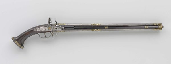 Editor: Here we have a breech-loading flintlock gun, dating back to 1790. Crafted with wood and metal, it’s a surprisingly elegant object, despite its inherent purpose. The polished barrel looks almost delicate against the darker, sculpted wooden stock. What historical narratives are woven into its creation and existence? Curator: This gun isn’t merely a weapon; it’s a product of its time, reflecting significant shifts in military technology and social power. In the late 18th century, firearm advancements directly influenced colonial expansion and revolution. How do you think access to these kinds of arms impacted the dynamics of power at that time? Editor: It's striking to think how much control a single object could exert! Mass production and distribution definitely democratized force to a degree, while enabling conquests on a larger scale. It’s unsettling. Curator: Precisely. Moreover, consider the institutions that collected and displayed firearms. Initially, arms were kept by royals and wealthy families. The history of displaying firearms really only started with specialized arsenals and armories to showcase new technologies. Then museums emerged with collections of arms as symbols of national identity. It became an art object with visual and cultural impact in society. How might exhibiting this firearm influence our contemporary understanding of that past? Editor: Presenting something like this as "art" really encourages critical examination. Does it normalize violence, or offer us space to reflect? I appreciate the complexity it reveals about our relationship with tools of war and conflict! Curator: Exactly! By viewing the gun through this historical lens, we move beyond its immediate function and consider the layered sociopolitical meanings it carries, even to this day.