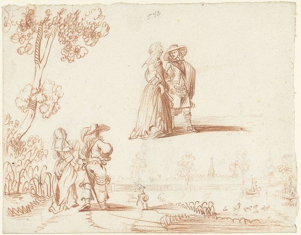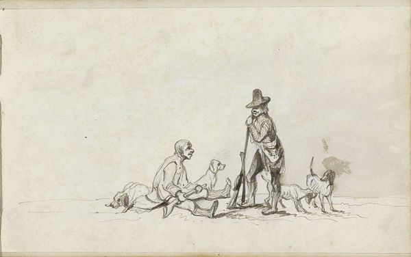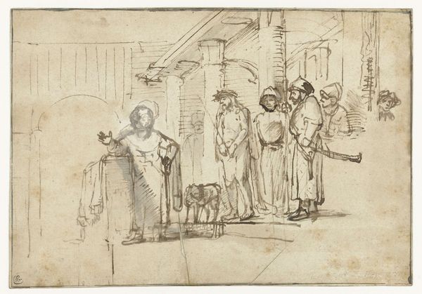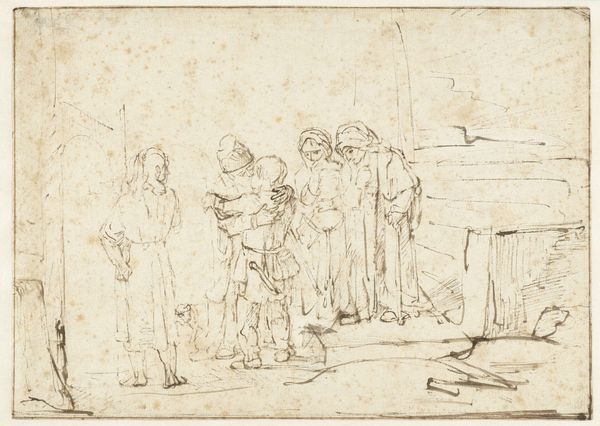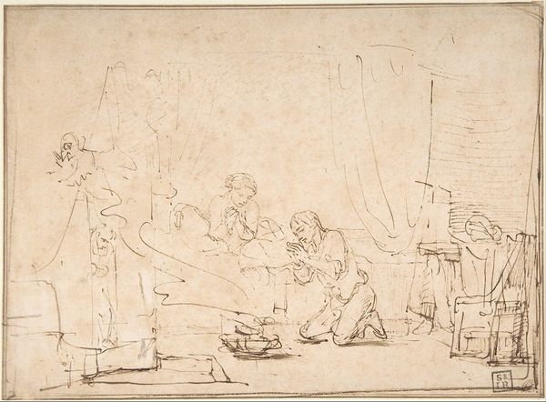 Editor: Here we have Rembrandt van Rijn's "David Receiving the News of Uriah’s Death," created around 1650. It’s an ink drawing on paper. The stark simplicity of the lines really strikes me – it feels so immediate and raw. What do you see in this piece? Curator: I see a potent depiction of power, gender, and accountability. Think about David’s position. As king, he abused his authority, leading to Uriah’s death to cover up his own affair with Bathsheba. Rembrandt, here, captures the moment when David’s actions catch up with him, highlighting the intersections of power, morality, and gendered violence. Does David appear remorseful? Editor: Not really. He seems more…stately than sorry, detached even. It’s the messenger who seems burdened. Curator: Precisely! This detachment is key. David’s regal bearing, even in this moment of revelation, underscores how power can insulate individuals from the consequences of their actions. Consider the power dynamics inherent in the narrative. David’s treatment of Bathsheba, his manipulation of Uriah – these are all acts enabled by his position. How does Rembrandt’s choice of medium, the quick strokes of ink on paper, reflect this? Editor: It lends a sense of urgency, a lack of polish. It’s like a glimpse behind the carefully constructed facade of royalty. Almost a snapshot. Curator: Yes! It resists idealization, offering a critical lens onto this biblical tale. We are confronted with the uncomfortable truth of how easily power can be corrupted and used to perpetuate harm, specifically towards a woman in his court and a loyal soldier. It invites us to examine similar dynamics in our contemporary world. Editor: I see the connection. So, Rembrandt isn't just illustrating a bible story; he's critiquing the abuse of power? Curator: Exactly! And in doing so, prompting us to consider how these systems of power continue to shape our social and political landscapes. This piece highlights the continued struggle to hold those in power accountable for their actions. Editor: That's powerful. I'll never look at a Rembrandt the same way again.