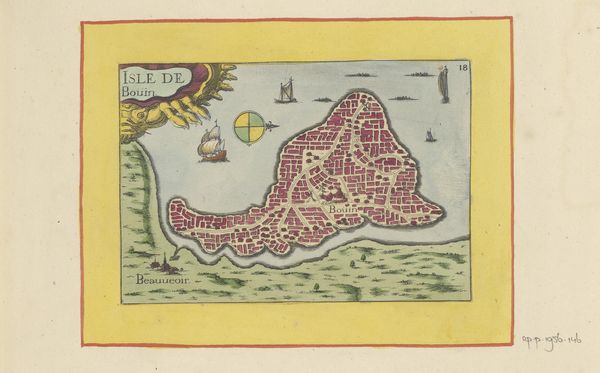 Curator: Let's take a closer look at "Kaart van Concarneau en omgeving," a watercolor from 1638, made by an anonymous artist. Editor: It's strikingly delicate! I am drawn to the details rendered at this miniature scale. You feel the vastness of the sea but also the vulnerability, with little ships against an encompassing open sea. Curator: Exactly! It's history and craft rolled into one. Look at the coloring process. What are the social structures behind a painter tasked to illustrate this strategic, crucial harbor location? The very production tells its own story. Editor: A harbor does signify shelter and a portal. But to map and render, as well as name "Concarneau," points to control. It is also the color scheme; the land represented in earthly green and brown tones stands in opposition to that vast, cool, airy openness implied by the dominating presence of light-blue and cool gray tones of the ocean itself. This speaks to freedom vs safety and belonging. Curator: The use of watercolor allows such detail while remaining portable. Imagine this map travelling across borders, facilitating trade or even war strategies! Think about the economic forces implied. What level of material, pigment or labour practices supported the commissioning of such work, its travel and storage? Editor: You are completely right to call out its utility. Beyond military gains or commodity exchange it evokes power but also fear of loss. Visually I keep landing on the fortification with this strong magenta; It visually suggests how it may signal the presence of human dominance—but also, paradoxically, smallness. The vast ocean minimizes humanity even within a safehold, and I keep contemplating those dual forces here! Curator: Thank you. Considering these details reveals much of the artist’s working process as well as its political moment. Editor: A confluence that changes how one can view it now.