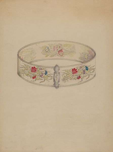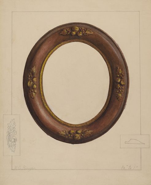 Betty Jacob made this watercolor and graphite drawing of a Toleware Tray. The tray presents as a study in contrasts, showcasing decorative elements set against a dark ground. The symmetry in the composition is notable, with fruit motifs mirrored on either side, lending a sense of formal balance. Look at the detailed latticework which alternates with stylized floral patterns, adding layers of visual texture to the tray's border. This juxtaposition of geometric and organic forms creates a subtle tension, indicative of a deeper structural interplay. The tray's interior is a study in muted tones, its cloudy texture stands out against the crispness of the tray's rim, furthering the dialogue between control and chance within the work. The additional sketch offers a minimalist view, reinforcing the artwork's concern with form and function. The work encourages us to explore the dynamic between ornamentation and utility.