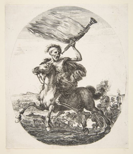 Editor: This engraving from 1706, titled "Spotprent op de keurvorst van Beieren," is attributed to an anonymous artist. It’s quite a striking image—a caricature really, poking fun at someone. I’m curious about the context. What do you see in this piece? Curator: This print is dripping with political satire. Understanding the historical moment—the War of the Spanish Succession—is crucial. We see the Elector of Bavaria, Maximillian II Emanuel, depicted not as a heroic leader, but as a figure of ridicule. Notice the shield emblazoned with frogs and the donkey he rides, symbols subverting his authority. How might this image challenge notions of power and leadership in its time? Editor: So it’s directly undermining his power by using these symbols. It is interesting the frogs on the shield and his less than gallant steed... But where would people see it? How effective would that actually be? Curator: Precisely. Consider this image’s circulation and reception. Prints like these, readily reproduced and distributed, served as potent propaganda tools. They fueled public opinion, mocked the powerful, and helped shape political discourse. Think about the power of satire in today's media—how artists use similar visual strategies to critique figures of authority. In what ways does this 18th-century print resonate with contemporary forms of protest? Editor: I hadn’t thought about the distribution of prints in that way before, and its surprising how modern the motivations behind it were! It’s definitely changed my perspective. Thank you! Curator: It's all about understanding how visual culture functions as a form of social commentary and intervention. Considering these prints allows us a window into the politics of the time.