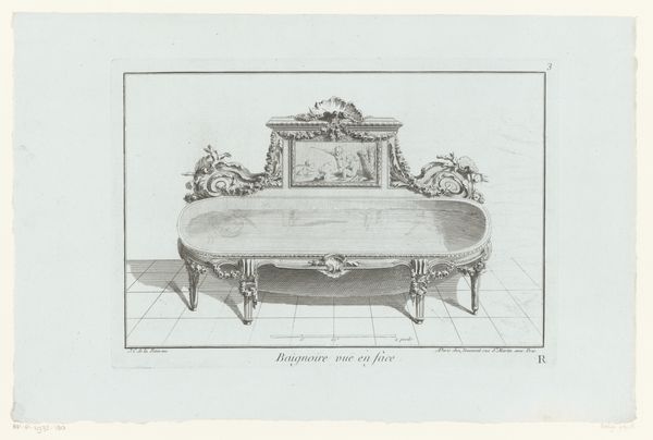 Editor: Here we have "Bank," an engraving from between 1753 and 1775, by an anonymous artist, currently residing here at the Rijksmuseum. There's something stark about the presentation; the geometric tile throws the ornateness of the sofa into sharp relief. What draws your eye in this work? Curator: That tension you observe – the ornate against the geometric – really sings to me. It’s like a whispered conversation between decadence and reason, wouldn't you agree? Look at the lines – that incredible precision married to the fluid curves of the rococo style. Almost like capturing a fleeting dream in ironclad logic! Do you feel that tension too, or something else entirely? Editor: Definitely the tension. It feels like a stage set, almost too perfect. It's interesting that the piece is simply named 'Bank,' like a blueprint rather than a portrait. Curator: "Bank," yes. I wonder, could it be a commentary, too, on the 'bank' of fashion, the storing and trading of stylistic currency? The line between art and design was so wonderfully blurred then, don't you think? Perhaps our anonymous artist is inviting us to sit not just on the sofa, but on the very edge of that era's aesthetic understanding. A pretty cheeky proposition, if you ask me! Editor: I hadn't thought of it that way. So much for just being a nice drawing of a fancy sofa! I guess I see more intention and artistry in the geometry and simplicity now. Curator: Indeed! Sometimes the most elaborate illusions hide in the simplest of lines. Now tell me, are you tempted to sketch one of your own? Editor: I might just! Thanks for pointing all that out.