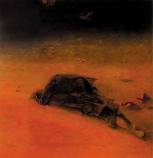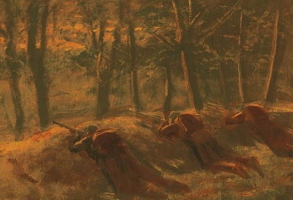 Laszlo Mednyanszky created ‘Evanescence’ using oil paints and canvas. The loose brushwork and earthy tones weren't accidental, but a deliberate choice to convey a certain kind of reality. Looking at the materiality of the painting, the coarse canvas texture seems to merge with the scene's rough ground. Mednyanszky’s thick application of paint adds a tactile quality, almost as if one could feel the weight of the bodies and the earth beneath. The browns and greens meld, blurring the distinction between the figures and the landscape, suggesting their merging with the earth. Although using traditional art material, this somber depiction speaks volumes about the social context in which it was made, capturing the precariousness of life and the toll of conflict, giving voice to the unseen and unheard. By considering the artist's process and the materials used, we understand how deeply the art is connected to the human experience.