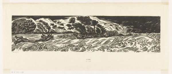 Editor: This is Johannes Frederik Engelbert ten Klooster’s “The Wave,” a woodcut from 1919. The stark contrast between the black and white creates such a dramatic and almost unsettling mood. What do you make of this? Curator: The dramatic effect is indeed striking. The wave, abstracted and powerful, becomes more than just water. Consider how the wave, as a symbol, often represents the immense, uncontrollable forces of nature. What might that signify, especially in the context of 1919, just after the First World War? Editor: So, you are saying it could represent the chaos of war? Curator: It could certainly be interpreted that way. Think of the emotional and psychological impact of such a devastating event. Artists often turned to nature to express feelings that were difficult to articulate directly. Do you see any other symbols in the image that reinforce this idea of turbulence? Editor: The ships being tossed around in the background seem like they might represent human vulnerability. Curator: Precisely! And the geometric lines used throughout...Do you notice a relationship between them? Editor: I see how those sharp lines could also represent the harsh realities of the time. The way everything is so stylized gives it this timeless, universal quality. Curator: Indeed. This artwork acts as a time capsule, embodying collective anxieties and perhaps a yearning for a new beginning. Its imagery speaks to the enduring human struggle against overwhelming odds, something still relevant today. Editor: That's fascinating. I never considered how much historical context could be embedded within such a seemingly simple image. Curator: Art becomes more profound when viewed as a repository of cultural memory. Exploring the symbolic language of images opens up a dialogue with the past.