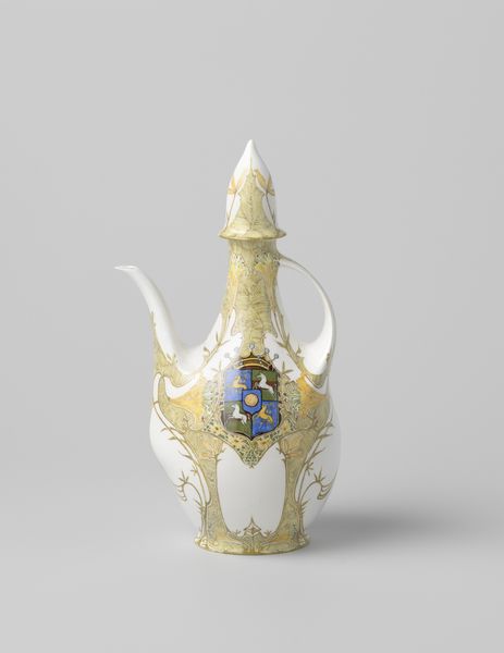 Editor: Here we have a milk jug, "Melkkan, deel van een tête-à-tête, beschilderd met lelies," crafted around 1900 by N.V. Haagsche Plateelfabriek Rozenburg. The earthenware feels so delicate, and the lilies and coat of arms give it an air of ceremony. What stands out to you about this piece? Curator: The presence of the coat of arms is quite telling. During this period, Rozenburg aimed to elevate Dutch ceramics to compete with porcelain traditions in other countries, particularly France and China. This jug reflects the aspirations of the Dutch bourgeoisie at the time, emulating aristocratic traditions of displaying heraldry. The lily motifs, typical of Art Nouveau, blend a modern aesthetic with symbols of established power. Editor: So it's a statement about social mobility through art? Was it common to see such explicit references to class in decorative arts? Curator: Absolutely. The late 19th century saw a fascination with history and lineage among the rising middle class. Owning decorative objects featuring heraldic symbols became a way to visually associate themselves with established power structures, a kind of performative identity through the domestic space. Why do you think earthenware was chosen over porcelain, though? Editor: Maybe earthenware allowed for a greater level of artistry? Porcelain requires more specific facilities and refined craftsmanship. Curator: Precisely! Earthenware also enabled more direct engagement, as Rozenburg's design relied heavily on individual artists’ skills, promoting their artistic identity along with Dutch industrial aspirations. It became a symbol of a "new" kind of nobility through art and craftsmanship. Editor: I hadn't considered how the materials themselves could contribute to this socio-political narrative. Thanks, that perspective has really changed how I see this jug! Curator: It’s fascinating how seemingly simple objects can reveal so much about societal aspirations and artistic innovation. Always consider what the artwork *does*, not just what it looks like!