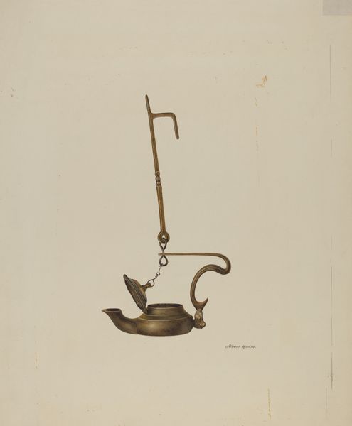 This is Charlotte Winter’s ‘Lamp,’ a watercolor rendering of an everyday object. Winter was part of the Index of American Design, a WPA initiative during the New Deal era. The Index sought to document and celebrate American folk art and design. Artists like Winter were employed to create detailed illustrations of objects, reflecting an effort to define and preserve a national cultural identity amidst economic hardship. In a time of great social upheaval, there was an urgency in affirming American traditions and values. Winter's lamp evokes a sense of nostalgia, connecting us to a simpler, pre-industrial past. It speaks to the resourcefulness and ingenuity of early American craftsmanship, yet its existence as a design object also raises questions about the relationship between art, labor, and cultural heritage during the Great Depression. It invites us to reflect on how we construct and commemorate our collective history.