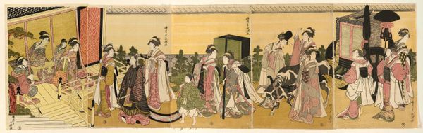 Curator: This is "Pilgrimage to Myōdōji in Horinouchi, Edo," a woodblock print made sometime between 1794 and 1814 by Utagawa Toyohiro. What strikes you about it initially? Editor: The composition! It’s split almost in two halves. On one side, there's a flurry of figures in a lively outdoor scene; on the other, a calmer, more enclosed interior space. It’s like two distinct worlds are coexisting on a single sheet. The subdued colors add a certain poignancy. Curator: The split offers a symbolic tension, wouldn't you agree? The outer scene overflows with representations of the temple's public face, its function within community life represented by those colorful robes, palanquins, and figures, a stark contrast to the inner scene’s private or spiritual devotion and retreat, the sacred feminine as it exists in both spaces. Editor: It also seems to echo a social stratification. Notice how the women are depicted, from the elaborately dressed figures on the left carrying the palanquin, seemingly confined to that task, to those inside engaged in what appears to be conversation and leisurely activity. Curator: Their elegant kimonos tell a story too; intricate patterns, rich colors reflecting not only taste, but also a connection to cultural memory. Each detail like that repeats. Their presence near Myōdōji speaks volumes about the feminine and sacred space in Shinto and Buddhist practice. The palanquin—a vehicle not just of transit but of significance in religious processions, carrying icons and sacred objects! Editor: Exactly! Pilgrimages were never purely religious experiences. They represented an intersection of the spiritual and the social—an opportunity for women, often restricted in their daily lives, to find community, maybe even express some agency in Edo society, as both a private citizen and devout participant in community and culture. What a powerful reflection of the past through contemporary experience! Curator: Agreed, by unpacking even small features we may rediscover hidden cultural truths. Editor: This piece helps to unearth a richer understanding of everyday social rituals and dynamics. Curator: For me, the symbolism leaves a mark, prompting contemplation.