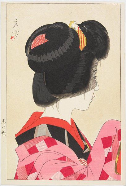 Yamakawa Shuho made this woodblock print, Rode kraag, and right away, you notice how the flat planes of colour create a study in composition. It's the kind of image where the process is part of the point. The way the colours are layered and how the texture emerges is really interesting. The artist is using the pink of the kimono to create a sensation of depth, playing with colour to make you feel like you could almost touch the image. Look closely, and you see the way the lines create a kind of dynamic energy, almost like the image is moving. The choice of rendering the subject in profile suggests the influence of earlier woodblock traditions, but the flattened perspective and bold use of colour mark Shuho as a modernizer, not dissimilar to how Matisse used colour. What makes this image so great is that it embraces both simplicity and subtlety.