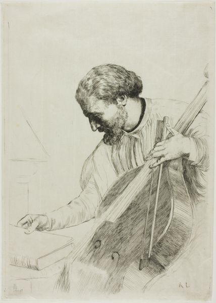 William Henry Huddle's 'Old Slave' is a deeply evocative painting of a man with a violin. The composition centres on the man's figure, his dark skin and weathered face rendered with a careful, almost tender touch. The backdrop is nondescript, with a blank, neutral palette that throws the figure into stark relief. Note the striking vermillion of the violin, held gingerly in his hands. The figure's gaze is cast downwards, creating a melancholic mood that pulls the viewer in. This portrait is not merely representational; it is a carefully constructed tableau that evokes a sense of memory, loss, and resilience. Huddle’s manipulation of light, texture, and the positioning of the subject all point to a deeper narrative. The painting’s strength lies in its ability to communicate through form. The artist doesn't dictate a singular meaning but invites contemplation, underscoring art's capacity to engage with complex, often unspoken, histories.