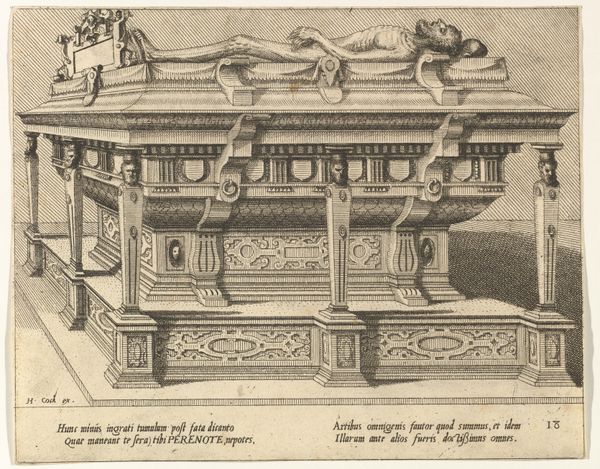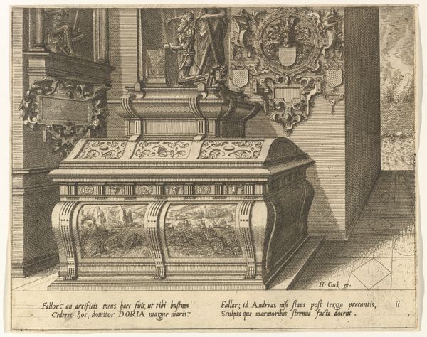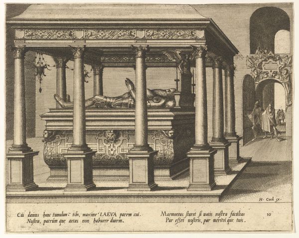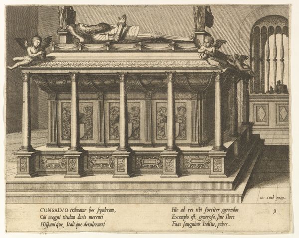Editor: This is *Cenotaphiorum (15)*, a 1563 engraving by Hans Vredeman de Vries, currently at the Met. It depicts a very ornate tomb. I find the profusion of details kind of overwhelming. How would you interpret this work? Curator: The overwhelming detail itself is quite telling, isn't it? Consider how the Renaissance revived classical forms, seeking to legitimize power through association with the grandeur of antiquity. Even the cherubs, figures borrowed from pagan traditions, now serve Christian or courtly agendas, acting as visual emblems. Do you see the figure on the right? Editor: Yes, near the arched doorway? They seem almost like they're peeking at the tomb. Curator: Exactly. What meaning could be drawn from their placement and role? It disrupts a straightforward reading of mourning; there’s almost a theatrical presentation here. Think of tombs in this period as stages upon which power was performed and remembered. It also creates a sense of mystery that permeates the symbolic order, as such adding complexity to the tomb symbolism beyond that of simple funereal piety. Editor: So the figure isn’t just mourning someone's death, but also presenting a narrative? Curator: Precisely! The tomb becomes a carrier of cultural memory, prompting reflection. Note also the allegorical figures, sculptures of ideals or virtues, which serve not only to aggrandize, but also to offer lessons for the living. These are often-revisited iconographies and, through art, they help keep societal knowledge present and circulating. Editor: That’s fascinating! I never considered how many layers of meaning are packed into what seems like a straightforward image. Curator: Indeed. Once you begin to see the language of symbols, entire worlds of meaning open up. Editor: I’ll definitely look at Renaissance art with a different perspective from now on.