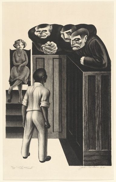 Editor: We're looking at Fritz Eichenberg's 1949 drawing and print, "Speech for the Defence." It depicts a speaker at a podium, but the dark tones and the guard looming behind him create a very tense atmosphere. What compositional elements strike you most powerfully? Curator: The stark contrasts in value immediately assert themselves, Editor. Observe how Eichenberg manipulates light and shadow to create depth and drama. The speaker is caught in a rather harsh light, drawing attention to his perhaps sinister features, while the background remains shrouded in darkness, punctuated only by the glint of the guard's rifle. Editor: Yes, it's almost theatrical, the way the light falls. And what about the poses? They seem very deliberate. Curator: Indeed. Consider the orator's downward gaze, suggesting perhaps guilt or unease. The guard's rigid posture creates a sense of oppressive authority. Even the angle of the podium serves to trap the speaker visually. Semiotically, these visual relationships indicate confinement and judgement. Editor: I see. So, the composition isn't just aesthetically pleasing but actively contributes to the narrative. Curator: Precisely. The formal elements serve as signifiers within a larger visual language, reinforcing the theme of a judicial error. Consider the contrast between the curves of the bottle and glass at the base of the podium and the hard geometry of the architectural setting and the characters themselves. What tension does this create, do you think? Editor: It emphasizes the human versus the mechanical perhaps - or corruption and the law. The geometric rigidity dominates, suggesting law is immutable and will prevail. Curator: Very astute, Editor. Ultimately, Eichenberg uses the visual vocabulary of form to make powerful statements about power and justice, using graphic clarity. Editor: I see how a purely formal reading can be so rich, looking beyond just what’s represented. Curator: Exactly. Close visual inspection reveals layers of complexity and intention.
