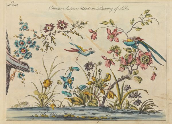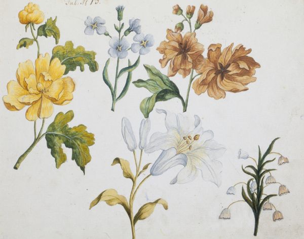 This anonymous work, "Flower Studies with Cornucopia Still Life", presents a delicate arrangement of botanical subjects rendered in watercolor on paper. The composition arranges clusters of flowers with an almost scientific precision and gentle colour palette, evoking a sense of tranquil observation. Each flower is meticulously outlined, emphasizing their individual forms while creating a unified field of natural motifs. The artist seems particularly interested in the contrast between organic, free-flowing shapes and their systematic rendering on a flat surface. Here we can see the tension between representation and abstraction as a kind of structuralist exercise. The flowers are both themselves and signs pointing to broader themes of nature and design. Their presentation creates an ambiguous space, challenging the viewer to consider how art mediates our understanding of the natural world and the semiotic systems we use to interpret it.
