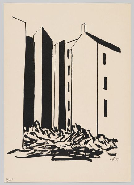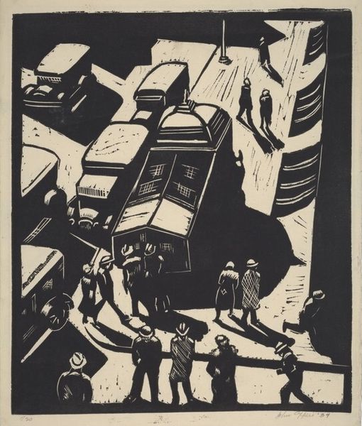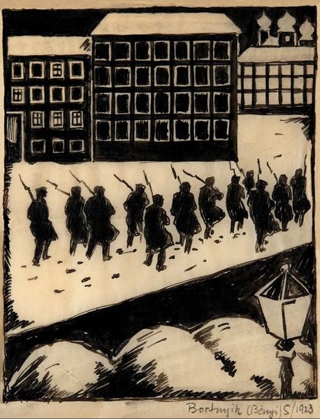Vasile Dobrian made this print, titled “Our Factories,” in 1961. It depicts a group of workers standing outside a factory complex. The artist seems to be working in the socialist realist style. The composition centers the heroic working class and the industrial landscape. The image employs a restricted palette of black and orange, using stark contrasts. This aligns with socialist art aesthetics prevalent in Eastern Europe during the mid-20th century. The title and imagery suggest a commentary on the social structures of the time. It reflects the prevailing ideology of state-owned industries as a collective achievement. Dobrian, born in Romania, lived through a period where art was often used as a tool to promote political agendas. To fully understand this work, we could research the Romanian art scene under communist rule. Investigating state policies on art production and exhibition can reveal the institutional forces that shaped Dobrian’s work and the messages it conveyed.