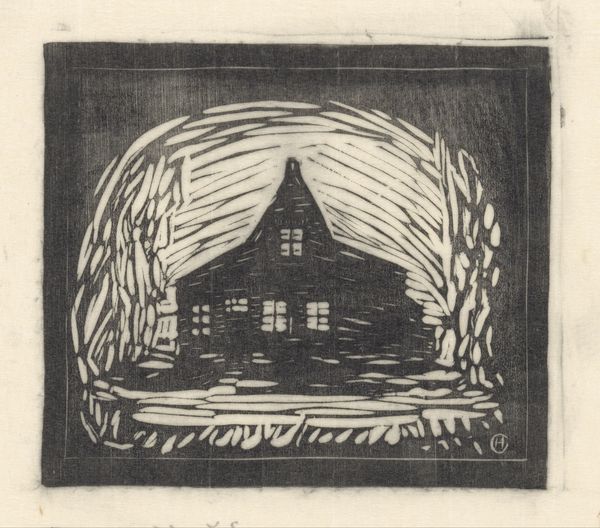 Editor: So, this is Karl A. Young's "Corner House," a small block print. It's striking how the stark black and white creates such a dramatic, almost ominous, feeling. What story do you think this print is trying to tell? Curator: This image speaks volumes about the representation of the American landscape in art. Notice how the corner house dominates the scene, a symbol of stability, yet the rough texture hints at the hardships of rural life. How might the artist's choice of a block print, a relatively accessible medium, affect its reception and social impact? Editor: That's interesting. I hadn't thought about how the medium itself influences the message. Curator: It's crucial. The print's accessibility allowed it to circulate widely, shaping perceptions of the American experience. What do you make of the absence of human figures? Editor: Maybe it emphasizes the solitary nature of the rural experience. It feels like the house is standing in for a person. Curator: Precisely! And this anthropomorphism transforms the house into a powerful symbol, charged with social and cultural meaning. I think I see this piece in a new light, now. Editor: Me too, it's amazing how much history can be packed into such a small image.