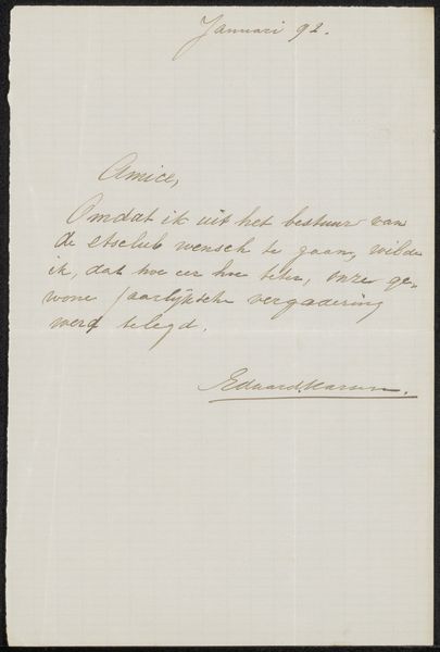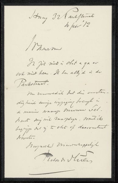 Editor: This is a letter titled "Brief aan Philip Zilcken" by Alphonse Daudet, made before 1882, using pen and ink on paper. The handwriting is quite elegant but also a little difficult to read. What strikes me most is the intimacy of a handwritten letter in a world of emails. What do you notice in this piece? Curator: A seemingly simple letter is never just that. Daudet uses ink on paper – these are the artifacts of a particular social ritual, a codified language of personal correspondence, right? How might the reader then approach the symbols inherent to its creation? What continuities exist? Editor: Symbols? Do you mean the words themselves or something more? Curator: I'm talking about more than just its surface text; a handwritten letter speaks of time and care, which evokes closeness. Think of the act of writing – the physical connection – versus the cold, digital detachment we often experience now. Can the medium become the message, resonating in our collective memory? What emotions and values does this medium then summon? Editor: I hadn't thought about the actual act of writing as being significant, more about what's being said. It makes you wonder about its authenticity today because it's tangible evidence of communication and a personal history. Curator: Exactly. This medium then reveals cultural continuity; handwritten text embodies the past’s tangible elements and emotional nuances, resonating within our collective memory and societal behaviors. Editor: That’s so interesting. It feels like viewing an artifact loaded with emotional history rather than a mere note. Thank you, I will reflect on it!