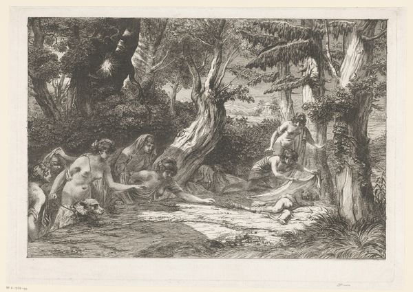 Curator: Looking at "Tobit Burying the Dead" from around 1650, by Giovanni Benedetto Castiglione, immediately evokes this somber atmosphere... don't you think? Like a shadowy stage. Editor: Absolutely. It’s undeniably poignant. The use of light and shadow crafts an almost palpable sense of grief, like a hushed response to state violence that extends into sacred life, which in this case is burial practice. It's interesting how even with so few visual cues, he stirs these visceral feelings. Curator: Right? The material itself adds to the feeling. It's an etching, a print. Knowing that adds to that ghostly feel, right? It is both reproducible and feels unique at the same time... like this sorrow, unfortunately, isn't just this one moment. Editor: Indeed. And consider how the Baroque aesthetic frequently turned to stories about faith and individual integrity against oppressive power, like that represented here in Tobit. In the biblical Book of Tobit, burying the dead was a subversive act, a silent protest in defiance of tyrannical rule that echoes resistance across eras. It transforms these acts of quiet defiance into visible statements. Curator: You know, when I look at the scene—these figures almost swallowed by darkness— I think about the power of intimate care during monumental turmoil, you know? Each stroke contributes to an immersive world, and the detail invites a kind of personal reckoning. It's like watching the most hushed part of a ritual from very, very far away. Editor: Yes, I completely agree! By intertwining faith, death, and rebellion, Castiglione offers a timeless reflection on our shared humanity in times of inhumanity, revealing how personal morality intertwines with the arc of history and how individuals negotiate the oppressing presence of regimes. Curator: Seeing it this way, the etching feels not just historical but incredibly… pertinent. Almost hauntingly relevant. Editor: Exactly. The layers within it urge us to engage with narratives of oppression and resilience. I walk away seeing not only a masterwork from the past but a stirring mirror held to today's world.