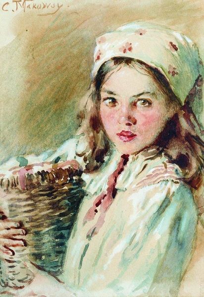 Konstantin Egorovich Makovsky painted this portrait, using delicate watercolors to capture the essence of girlhood. The beauty of watercolor lies in its fluidity and translucence. See how Makovsky allows the paper's surface to shine through, creating a luminous effect. Each brushstroke contributes to the overall impression, building up layers of color to define form and texture. This wasn't merely about representation; it was about evoking a feeling, a mood. Watercolors have a unique immediacy, demanding quick decisions and confident execution. The artist had to work swiftly, embracing the unpredictable nature of the medium. It is interesting to consider how different the effect would have been, if Makovsky had opted for the heavy materiality of oil paint instead. Makovsky elevates the everyday by using traditional, yet accessible materials, highlighting the beauty inherent in simplicity and the act of painting itself.