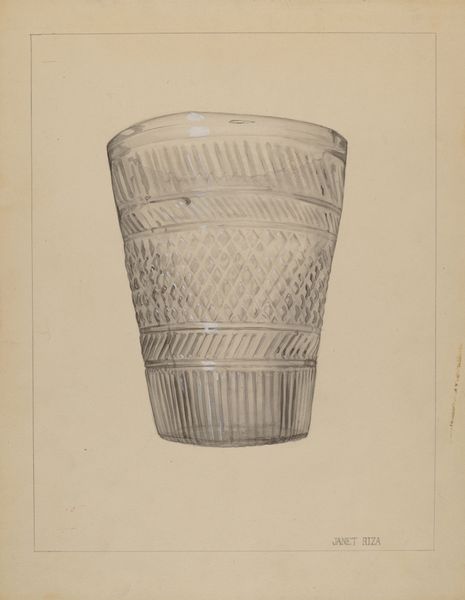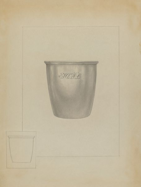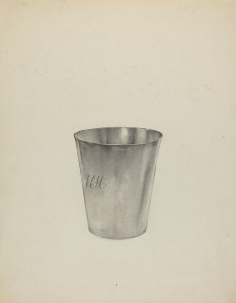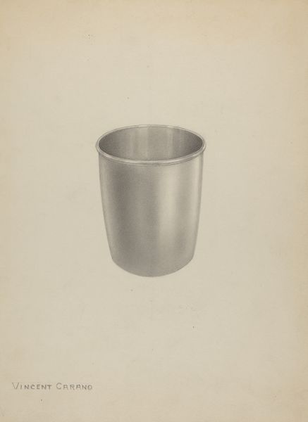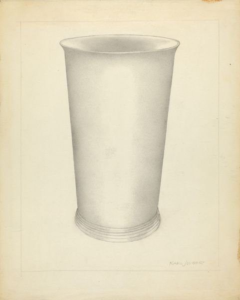Curator: It has a quiet dignity, almost severe in its simplicity. Editor: Welcome. We are looking at "Silver Beaker," a pencil drawing from around 1936 by Isidore Steinberg. Curator: It reminds me of minimalist sculpture, of Brancusi's vessels, but rendered with such painstaking detail. Look at the variations in tone, the subtle gradients that imply volume. Editor: Indeed. One might consider this humble beaker as a chalice—a vessel, historically speaking, holding spiritual and social weight. A plain silver beaker might denote austerity or humble means. Yet silver carries long symbolic association with the lunar, the feminine, even magical protection. Curator: Absolutely, the form is interesting, a study in verticality, its soft lines tempered by horizontal banding that roots it to the plane of the paper. Consider too, the curious inclusion of the underdrawing at the bottom left; a ghostly miniature reflecting the finished piece. Editor: Yes, it invites comparison and contemplation about the artistic process. Cups, mugs, and beakers are also emblems of hearth and home, daily life—and given that Steinberg created it around the Depression, the object depicted here assumes an even more compelling significance. Curator: I agree; in the end, it's a remarkably potent composition. The limited palette focuses one's attention entirely on form and light. It almost transcends its utilitarian subject matter. Editor: Ultimately, the cultural power of humble objects continues to move and affect how we understand life, culture, and art. Curator: And on closer inspection, one cannot deny the masterful skill deployed in capturing its silvery sheen and structural composition.