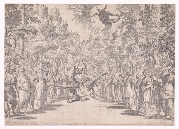 This print, made by Mathäus Küsel, gives us a glimpse into the world of 17th-century theatrical set design. It's made with the intaglio process, where the design is incised into a metal plate, and then ink is carefully applied and wiped, leaving it only in the etched lines. The printmaker then presses paper against the plate, transferring the image. Looking closely, you can see how the fine lines create a sense of depth and texture, from the dense foliage to the flowing garments of the figures. But beyond the visual representation, this print speaks volumes about the social context of theatre production. Stage design was a collaborative effort, involving skilled carpenters, painters, and costume makers. Each contributed to the spectacle. Prints like this one were important in circulating designs and ideas, influencing theatrical productions across Europe. By focusing on the material process of printmaking, we gain insight into the labor, skill, and cultural exchange that shaped the world of early modern theatre. It reminds us that even seemingly simple images carry complex stories about the hands that made them and the societies that consumed them.