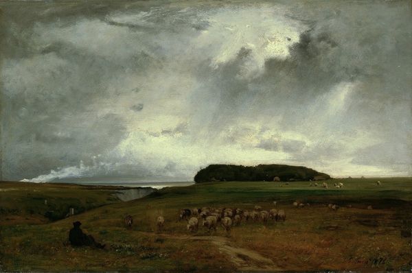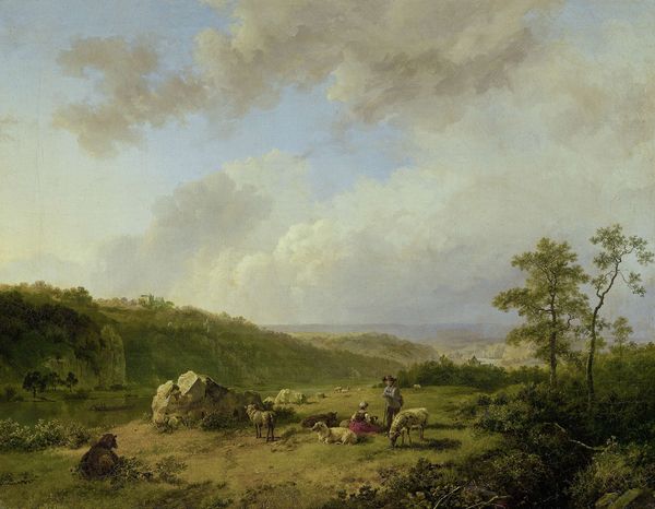 Aelbert Cuyp rendered this "River Landscape with Cows" using oil on canvas. Observe how the composition is structured around a subtle diagonal that pulls the viewer's eye from the lower left, where the cows are gathered, up towards the distant figures on the right. Cuyp's use of light is particularly striking. It's not just about illuminating the scene, but also about creating a sense of atmosphere. The diffused, golden light seems to envelop everything, softening the forms and blurring the details. This technique, known as aerial perspective, was crucial for Dutch landscape painters in creating depth and realism. Notice the way the light interacts with the clouds, creating a dynamic interplay of shadow and brightness. The painting functions semiotically through a balance between the grounded, earthy tones of the foreground and the ethereal, expansive sky. This contrast invites us to contemplate the relationship between the tangible and the transcendent. The cows, rendered with a keen eye for detail, anchor the composition, while the luminous sky opens up a space for contemplation.