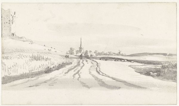Georges Michel created this drawing, "Weg op de Butte met molens in het verschiet", with graphite. The composition presents a muted palette and focuses on the geometric forms within the natural landscape. Michel's rendering uses subtle gradations of tone to evoke a sense of depth and distance. The foreground is dominated by a cluster of buildings, rendered with sharp, distinct lines that contrast with the softer, hazier rendering of the windmills. The perspective guides us into the landscape, but also hints at a structure of pictorial space. Michel challenges traditional landscape painting by emphasizing the formal elements of line, tone, and composition. Instead of depicting a romantic vision of nature, he reduces the scene to its essential components. In this way, the drawing invites us to consider the fundamental relationship between artistic representation, the materiality of the graphite, and the constructed nature of our perceptions.