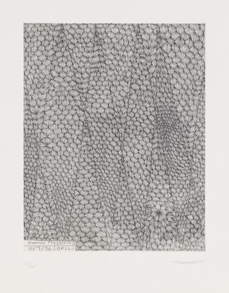 Edward Renouf made this untitled work with graphite, or a similar material, on paper. It’s a blizzard of marks. Looking at it, I’m thinking about the act of drawing as a process, a kind of meditation. See how the marks build up, layer upon layer? There’s a real physicality to it. It makes me think of Agnes Martin, but if she’d taken a wrong turn somewhere and ended up in a forest. If you look closely at the bottom left, there’s an area where the marks are denser. It’s almost like a focal point, a place where the energy of the whole image seems to concentrate. The texture feels almost like fabric there. It’s a beautiful, ambiguous piece. Like a whisper of something you can’t quite grasp. What does it remind *you* of?