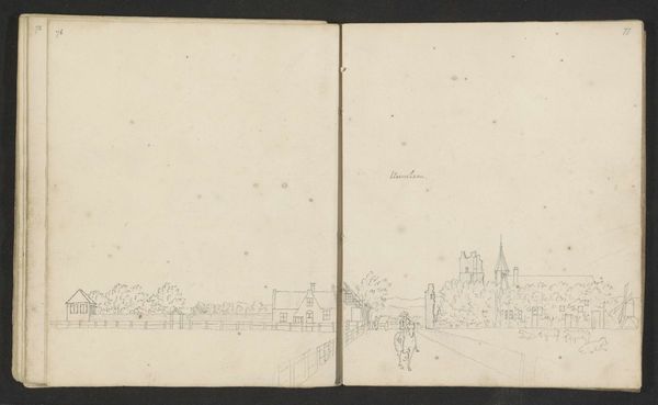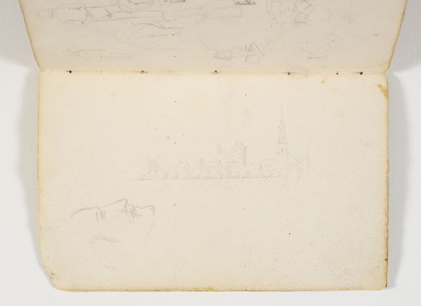 Curator: What a remarkably serene scene. It almost feels as though time has stood still. Editor: It's ghostly, in a way, stripped bare and floating amidst all that white space of the sketchbook. A skeletal version of the town, would you say? Curator: Precisely! We're looking at a Dutch Golden Age drawing, circa 1728-1732, by Cornelis Pronk. He captured the vista of Middelburg, focusing on the Abbey Tower and the Town Hall. It is currently held in the Rijksmuseum. Pronk used ink on paper, favouring a minimalistic representation to offer, I suspect, an objective likeness of the city, or more of an emotional reflection. Editor: Yes, I am drawn to how unpopulated the scene feels. Is this just his technique, or might this image reflect something deeper about Middelburg’s socio-political landscape at the time? A city depleted perhaps after wars, or plagues. What statement does this artist intend to evoke? Curator: The bareness emphasizes, I'd say, the skyline. Towers reach heavenward, anchoring the scene in faith, progress, perhaps ambition. Look how the ink carefully traces those architectural outlines. There's reverence, a desire for clarity in these structures that cut through the sky. And what endures across history if not the structure. These are markers that help us define ourselves, giving us recognizable symbolic reference points to navigate through space and time. Editor: I see what you mean. Those vertical thrusts provide contrast to the sprawl of human-made structures nestled into the natural environment, yet, doesn't the lack of people normalize the historical amnesia around who benefitted from those beautiful structures? Was Middelburg equally available to all, or do we need to contextualize such idealistic iconography with the colonial powers at play during that historical period? What are some of the silences implied? Curator: An interesting point about silence; certainly, absences provoke a critical reflection on value, and the structures provide a visible frame for interpreting society at a given moment. Still, one might say that this image endures precisely because we are able to locate shared dreams inside of it. What survives, visually, from Middelburg then transcends merely materialist conditions, so we are moved to look towards these cultural echoes again and again, always evolving new frameworks for appreciation. Editor: True. It invites endless rounds of interpretations depending on our place within history, wouldn’t you say? This pushes me to ask more questions from it. Curator: And so it shall. May its visual symbolism forever elicit introspection.