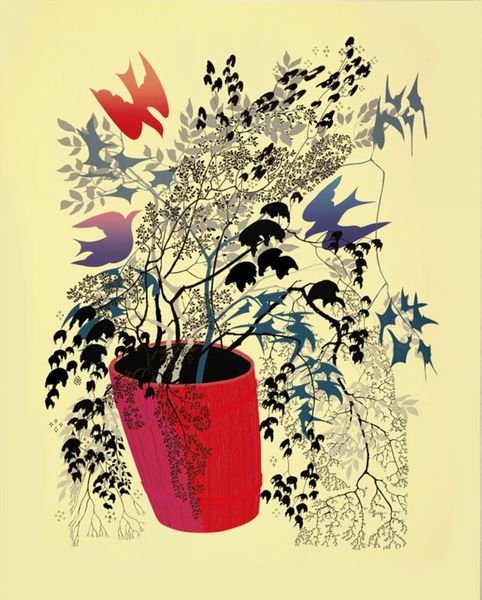 Curator: Ivor Abrahams' screenprint, simply titled "Sunflowers," offers a fascinating exploration of garden aesthetics. What's your initial take? Editor: It's so cheerfully artificial! Like a child's drawing of nature, but with this strange, almost unsettling, rigidity. Curator: Well, consider the process: a screenprint allows for precise layering and flat planes of color. It’s interesting how Abrahams employs this, mimicking mass-produced imagery, almost like garden ornamentation itself. Editor: Exactly! Those brick edges—so neat, so contained. It's as if nature is commodified, packaged for our consumption. I feel a longing for wildness looking at it. Curator: And that contrast is key. The very act of printing this image brings attention to the artificiality inherent in our relationship with the natural world. Editor: It’s definitely given me a fresh perspective on how we frame, literally and figuratively, our idea of a garden. Curator: Indeed, it reveals the layers of artifice shaping our perception of something as seemingly natural as a sunflower. Editor: Makes you think differently about visiting a garden.