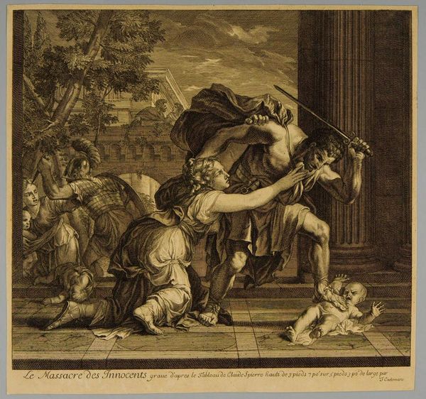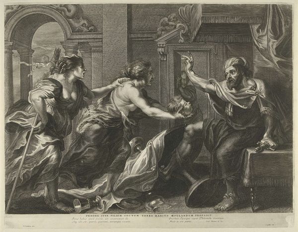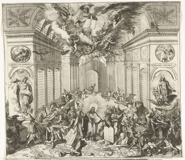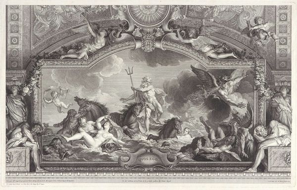 François Morellon La Cave created this engraving, "Wedding of Alexander and Roxana," which now resides in the Rijksmuseum. The print presents a tableau vivant, rich in allegorical figures and classical architecture, all rendered in precise detail. Consider how the composition directs our gaze. The eye is drawn to the contrast between the architectural elements and the soft, fleshy forms of the figures. The composition is structured by a series of arches and drapes. The formal qualities of the engraving—its use of light and shadow, its arrangement of figures in space—invite us to decode the symbolic order of the scene. The cupids and other figures, while seemingly decorative, play a structural role in conveying the themes of love, conquest, and divine blessing. This artwork, while seemingly celebrating a historical event, engages with broader themes of power, beauty, and the construction of historical narratives. The very act of interpreting this engraving is an invitation to question the fixed meanings of history and art.